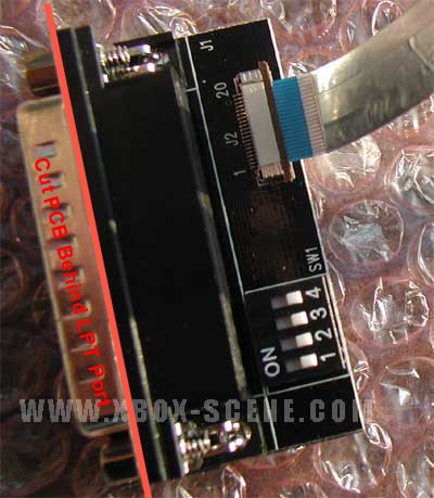 You will be taking off the dipswitches from the flash adaptor and soldering wires in their place. These wires will connect to switches which will be mounted on the front of the Xbox. On the top of the Xbox (just behind the DVD drive) you will be mounting the LPT (parallel) port and the actual flash adaptor.
